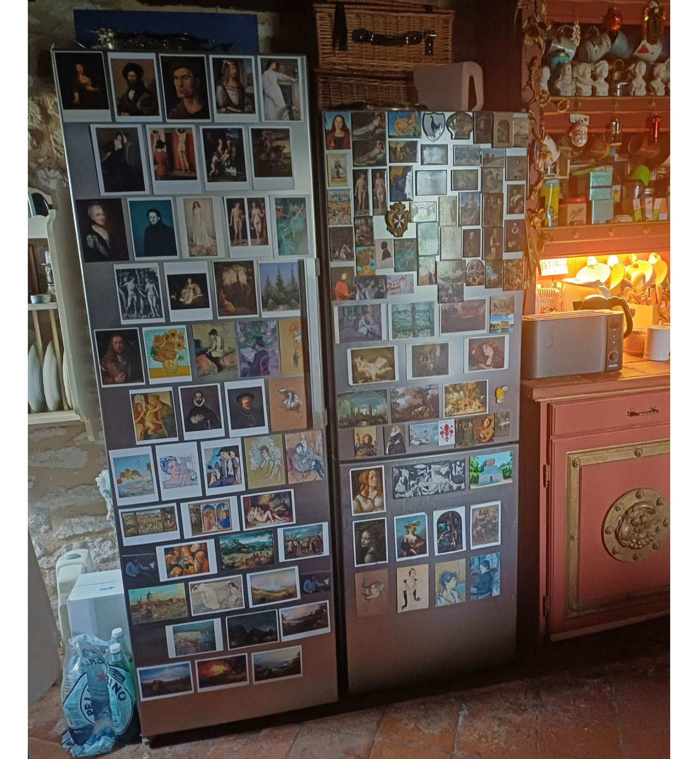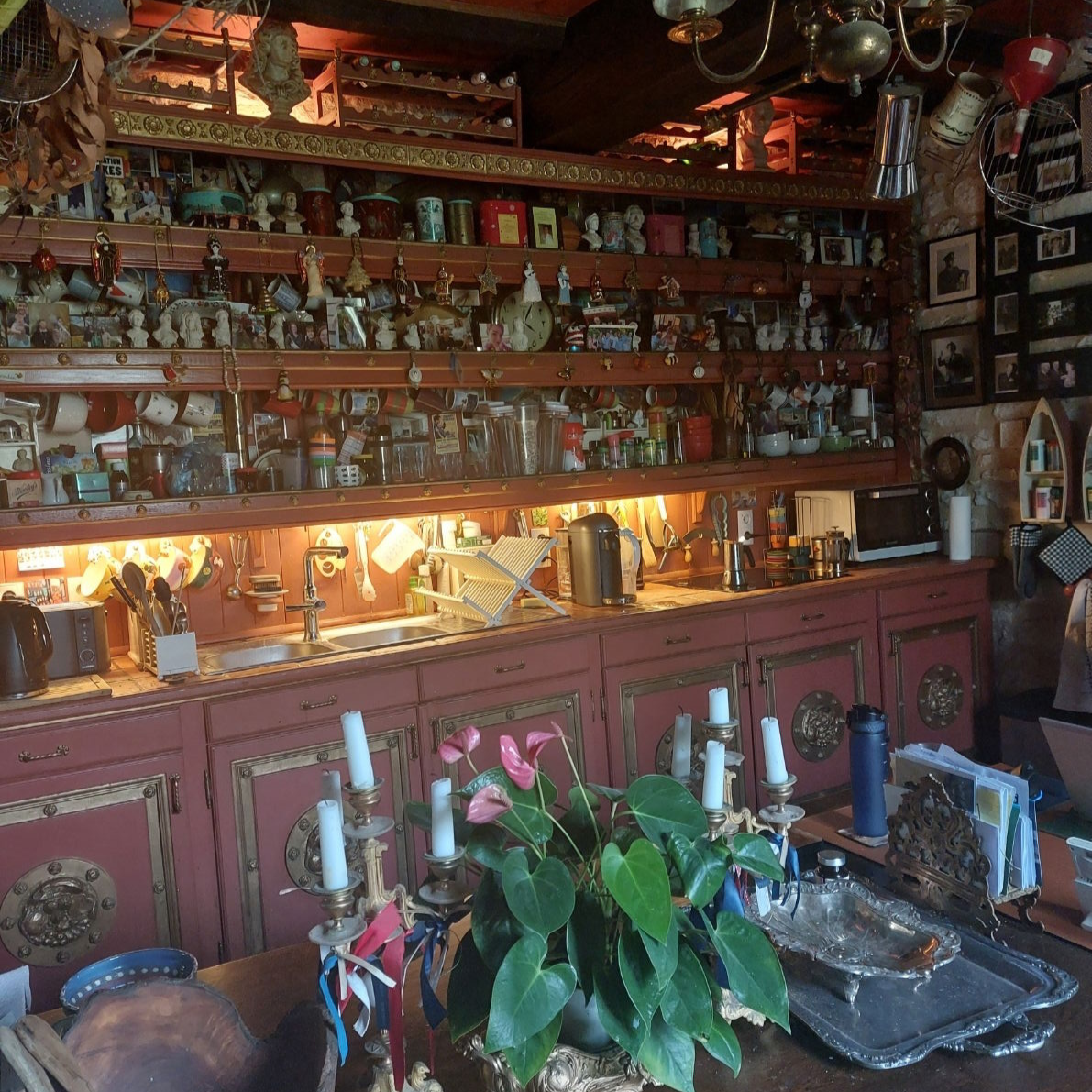 https://www.florajamieson.co.uk/traditional-stained-glassThis is a classic example both of Brendan Bruce's 'back story' installations, and his notion that even ordinary items eg in this case household furniture, can be turned into art, or even 'art'. The cabinets below were made by a local carpenter, and the roundels were created by Suzanne Shillingford as a tribute to the great ceramicist Bernard Palissy (1510–1590). The back story is that the dresser is part of a much longer piece of kitchen furniture from a large nearby chateau, and was saved from demolition by a piece of quick thinking. The dresser section is decorated with an air-dried plaster-based frieze to Brendan's design. It is decorated by hundreds of found objects, ranging from stuffed piranha to sterling silver advertising awards; from plaster busts, to F&M music boxes. It is festooned with hanging ornaments, gifts from friends, holiday souvenirs, postcards from his mother's travels, photographs and Christmas baubles. The two side pillars are covered in Campsis trumpet vines in flower, and the wall lizards, which are common in the courtyard water garden. On the third tier above the dresser and the cabinets are four wine racks decorated by gilded plastic heads of famous French figures from history (originally given away at petrol stations), and two antique busts of Messrs. Mansart and Arouet.
