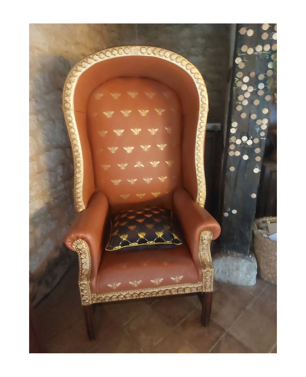 Né le 28 février 1533 au château de Montaigne en Périgord, Michel Eyquem de Montaigne est issu d'une famille de négociants bordelais. Son arrière grand-père, Ramon Eyquem, fait l'acquisition en 1477 de cette maison forte du XIVème siècle, et accède ainsi au noble statut de Seigneur de Montaigne qu'il lèguera à ses enfants et petits-enfants. De ces derniers, Pierre Eyquem est le premier à quitter le comptoir familial pour venir s'installer dans la demeure périgourdine qu'il fait aménager et fortifier. De son mariage avec Antoinette de Louppes, fille d'un marchand toulousain, il aura huit enfants dont Michel est l'aîné.A chair designed to be so grand, expensive and intimidating that nobody dares sit in it. Restored nineteenth porter's chair, re-covered by a professional French tapissière. Decorations in gold paint using a repetitive stencil pattern from a chalk cartoon type paper template designed by Brendan Bruce, using his two bees symbol; and in both air-dried and oven-baked plaster from silicon moulds and some hand moulding. Applied gilt trim, with brass bees. Monogrammed rosette emblems. Shop bought decorated cushion, with gilt bees.
