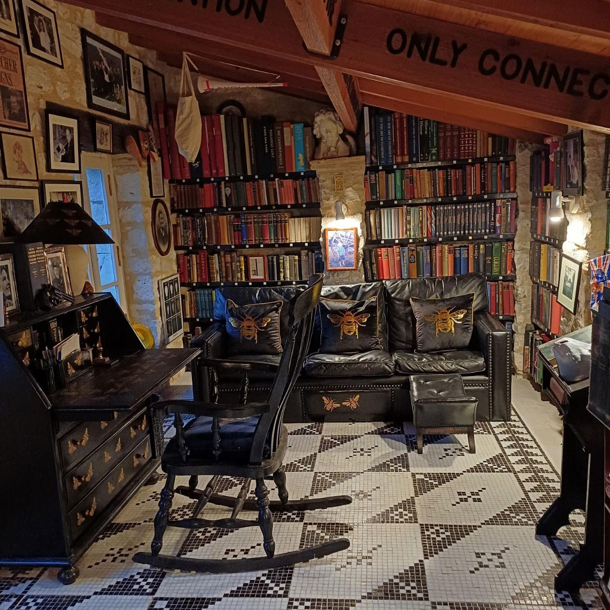 Designed and made by Brendan Bruce from black and white mosaic tesserae, glued to a reinforced concrete base using the Roman or mirror reverse method, where the tesserae are laid down in wooden trays, and the concrete poured over them. The main elongated star design was adapted from a small room at the imperial villa at Piazza Armerina in Sicily. The border pattern from a Roman villa in England. Note the mosaics let into the leading edge of the shelves, eight are white, but the seventh is gilded. This used to be two rooms with a wall dividing them. The near side was a chicken house. And the far end was the farm's lavatory (i.e. a plank, a hole, and a bucket), entered through what is now a window, replacing the original door. The quotations on the beams were inspired by Montaigne's tower study. Montaigne's chateau is located 80 kilometres to the north west of the Gallery.
